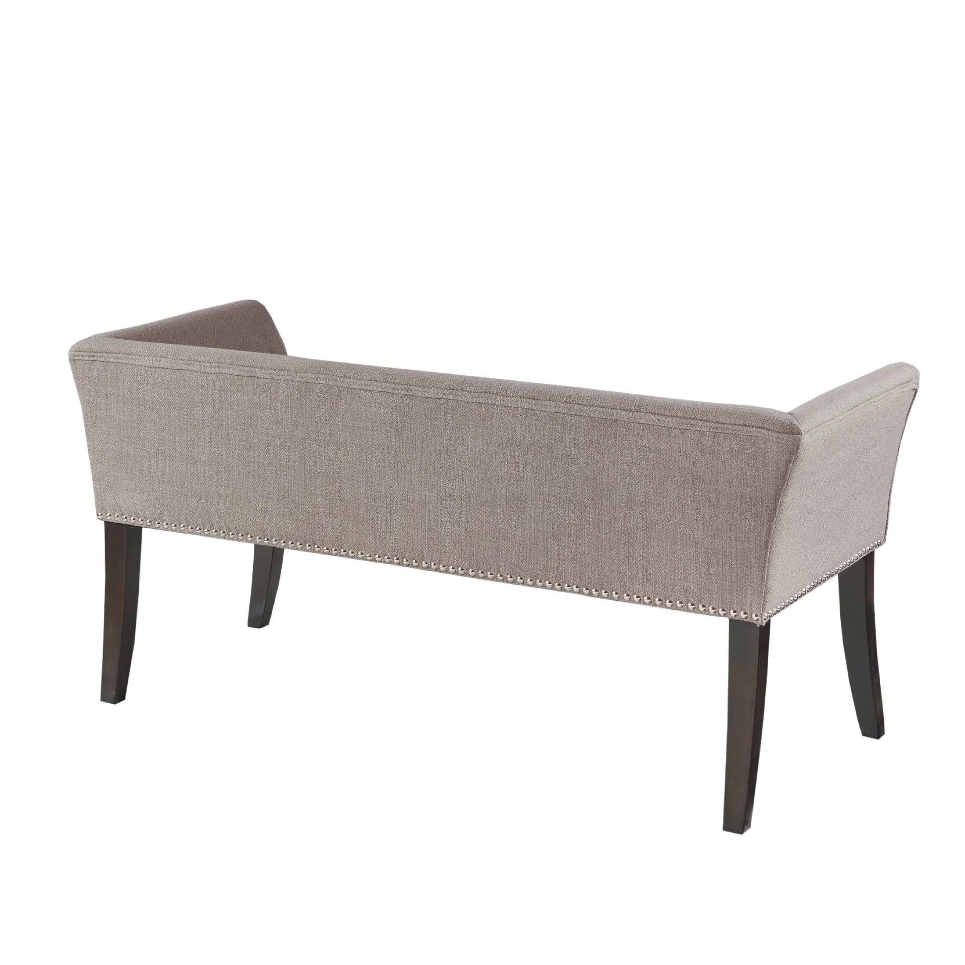 Upgrade your home decor with the Madison Park Antonio Upholstered Rectangular Accent Bench. Upholstered in a beautiful hued fabric, this bench features a low back and flared arms that create a sleek and sophisticated look. The bronze nailhead trim adds an elegant accent while the light wood finish complements the upholstery perfectly. Perfect for any room, this bench provides a chic update to your living space.