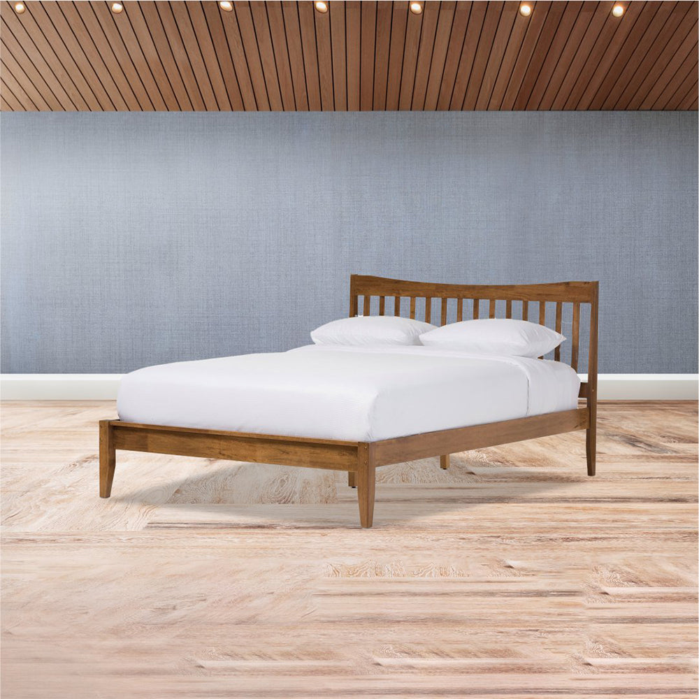 Boasting a straightforward and refined design, the Walnut Platform Bed effortlessly complements various interior aesthetics. For an ambiance reminiscent of boutique hotel chic, augment its appeal with plush velvet and faux fur accessories. Crafted from environmentally friendly solid rubberwood and poplar, the bed frame ensures enduring durability. The slatted design of the headboard, coupled with a tapering degree, evokes a retro sensibility. The overall retro feel is accentuated by tapered legs, contributing to the bed's aesthetic completeness. The low footboard imparts an illusion of open space, and the bed's under-clearance area offers practical storage options.