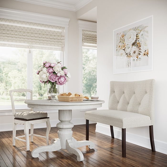 Upholstered, modern style settee, ideal as an accent piece. The button tufts add a touch of elegance. It’s simplicity and neutral color make it the perfect addition to any living space in the home.